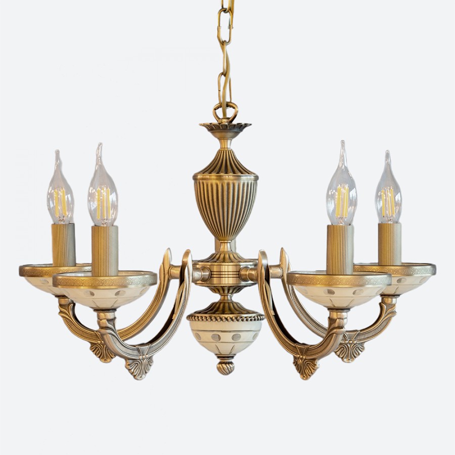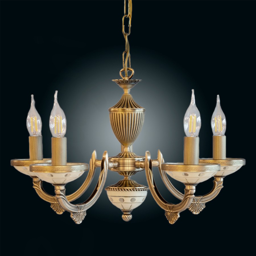 Конструкция светильника предусматривает применение 5 ламп с цоколем E14, общая мощность 300 Вт, что позволяет осветить 22 м2.